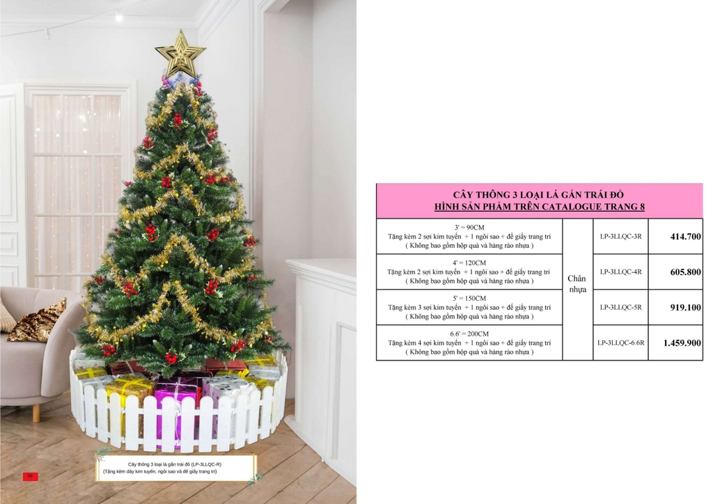 Cây thông A6 cước nở hoa gắn trái đỏ và trái thông lẫn kim tuyến - cây tự động